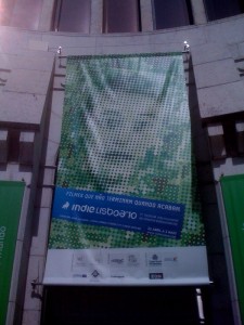 Here’s your first sighting outside Indie Lisboa headquarters at Lisbon’s vast cultural center, Culturgest. The festival’s poster design this year plays on the same Ben Day dots style which Roy Lechtnestein imported into his form of Pop Art nearly 50 years ago. This style plays through in the festival’s overall graphics design system, which really is the first thing that hits a viewer at any film festival—perhaps even more than the program lineup itself.