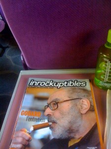 When traveling to Cannes for the festival, I enjoy taking the train straight from Paris De Gaulle (where The Volcano wasn’t interrupting flights, unlike several other Euro hubs) direct to Cannes. Via the French SNCF bullet train aka TGV, which gets you from point to point in a little over five hours. It lets me catch some zzzzz’s (nine time zones can mess you up), and read my favorite French magazine, Les Inrockuptibles. Even better, with Jean-Luc Godard on the cover. (Here’s the magazine, lying on my seat’s desk tray.) Inside is a frank and expansive interview with J-L G, who argues vociferously against the notion of artists’ rights and property, against the Swiss government (he being a citizen, after all) for failing to protect Roman Polanski from extradition to Los Angeles and for the notion that a film can embrace both Husserl and Patti Smith. Such as his own, “Film Socialisme,” which remains certainly the most anticipated film here at Cannes. The film is a triptych, which starts on a ship touring the Mediterranean—shades of “A Talking Picture,” by 101-year-old Manoel de Oliveira, whose “The Strange Case of Angelica” is the festival’s first unqualified triumph, and certainly one of the master’s greatest films over his past, extraordinarily active decade. My Variety review pretty much says it all, but if you can’t past the paywall, let’s just say that it is cinema storytelling at the level of pure grace, quietly capturing cinema’s always-unresolved debate between the realist and the fantastic, the matter of whether what we see is altered by the photographic image, or whether our eyes determine the text of the image. Oliveira has transformed that debate into a chamber tragedy, both ridiculous and charming. (The scene with a bird in a cage, an obedient cat and an off-screen dog is already on it’s way to become the stuff of legend.) Meanwhile, as the Les Inrock photo shows, Godard is still plenty healthy enough to chomp on his cigars….Good luck getting into HIS press conference….